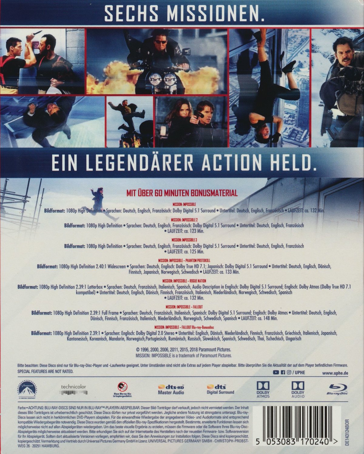 Sechs Missionen. Ein legendärer Action-Held.Seit fast zwei Jahrzehnten auf gefährlicher Mission: Tom Cruise arbeitet als Geheimagent Ethan Hunt für die Spezialeinheit der Impossible Missions Force (IMF). Als einer der größten Actionhelden aller Zeiten schreibt er mit der adrenalingetriebenen Blockbusterreihe "Mission: Impossible" Kinogeschichte - an den exotischsten Drehorten der Welt und an der Seite der besten Regisseure Hollywoods.Diese Box mit allen 6 Einsätzen ist ein Must-have für Actionfans und eine spannungsgeladene Herausforderung - selbst für das stärkste Nervenkostüm. Ihr Auftrag, sofern Sie ihn annehmen, ist atemberaubende Kinounterhaltung zu genießen!Alle 6 Filme in einer Box:- Mission: Impossible- Mission: Impossible 2- Mission: Impossible 3- Mission: Impossible - Phantom Protokoll- Mission: Impossible - Rogue Nation- Mission: Impossible - FalloutDie Blu-ray Version enthält eine zusätzliche Bonus-Disc