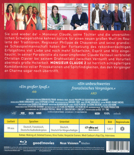 Sie sind wieder da! – Monsieur Claude, seine Töchter und die unversöhnlichen Schwiegersöhne kehren zurück für einen neuen großen Wurf im Roulette der Traditionen. Regisseur Philippe de Chauveron und seine grandiose Schauspielmannschaft haben der Fortsetzung des rekordverdächtigen Erfolgsfilms viel Liebe und noch mehr Scharfsinn, Esprit und Witz eingehaucht. In seiner Paraderolle als naserümpfender Claude Verneuil verbreitet Christian Clavier bei seinem Drahtseilakt zwischen Vernunft und Vorurteil abermals große Heiterkeit. MONSIEUR CLAUDE 2 ist herrlich schlagfertiges Komödienkino voller Provokationen und Spitzfindigkeiten, das den Vorgänger an Charme sogar noch übertrifft.