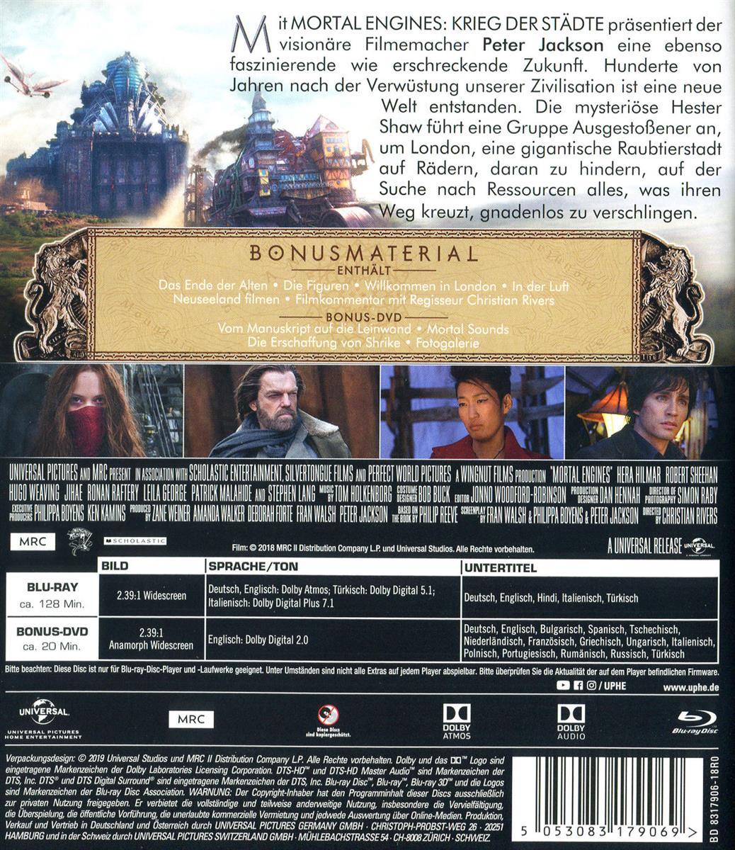Mit "Mortal Engines: Krieg der Städte" präsentiert der visionäre Filmemacher Peter Jackson eine ebenso faszinierende wie erschreckende Zukunft.Hunderte von Jahren nach der Verwüstung unserer Zivilisation ist eine neue Welt entstanden. Die mysteriöse Hester Shaw führt eine Gruppe Ausgestoßener an, um London, eine gigantische Raubtierstadt auf Rädern, daran zu hindern, auf der Suche nach Ressourcen alles, was ihren Weg kreuzt, gnadenlos zu verschlingen.Inklusive Bonus DVD!