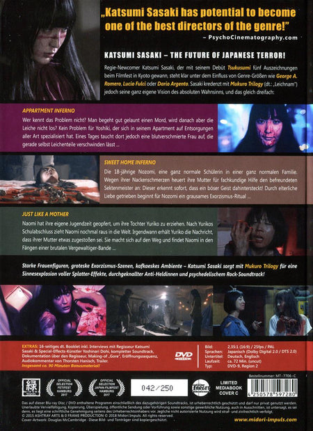 Regie-Newcomer Katsumi Sasaki, der mit seinem Debüt Tsukusumi fünf Auszeichnungen beim Filmfest in Kyoto gewann, steht klar unter dem Einfluss von Genre-Größen wie George A. Romeo, Lucio Fulci oder Dario Argento. Sasaki kredenzt mit Mukuro Trilogy (dt.: „Leichnam“) jedoch seine ganz eigene Vision des absoluten Wahnsinns, und das gleich dreifach!