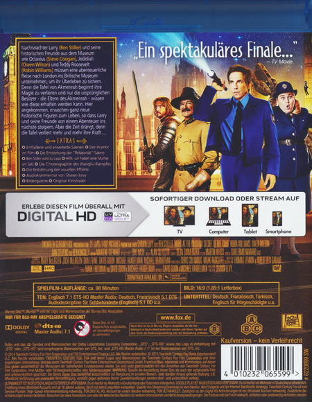 Enthält: Entfallene und Erweiterte Szenen; Improvisation, Absurditäten und Wahnsinn – Der Humor im Film; Relativität; Ben Stiller wird zu Laa; Hilfe, wir haben eine Mumie am Set!; Kampf im Museum; Die Entstehung der visuellen Effekte; Audiokommentar von Shawn Levy; Bildergalerie; Original Kinotrailer;