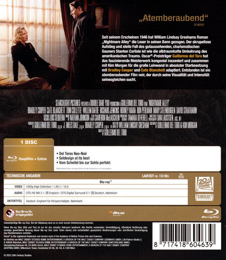 Seit seinem Erscheinen 1946 hat William Lindsay Greshams Roman „Nightmare Alley“ die Leser in seinen Bann gezogen. Der skrupellose Aufstieg und steile Fall des gutaussehenden, charismatischen Gauners Stanton Carlisle ist wie die albtraumhafte Umkehrung des amerikanischen Traums. Oscar®-Preisträger Guillermo del Toro hat das faszinierende Meisterwerk kongenial inszeniert und zusammen mit Kim Morgan für die große Leinwand in absoluter Starbesetzung mit Bradley Cooper und Cate Blanchett adaptiert. Entstanden ist ein atemberaubender Film noir, der durch seine Visualität und