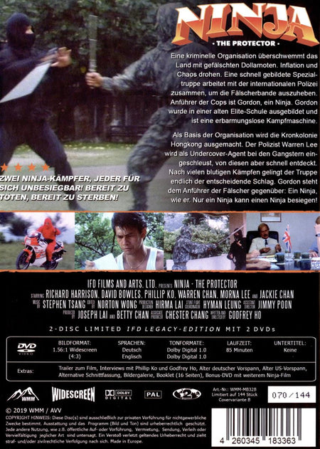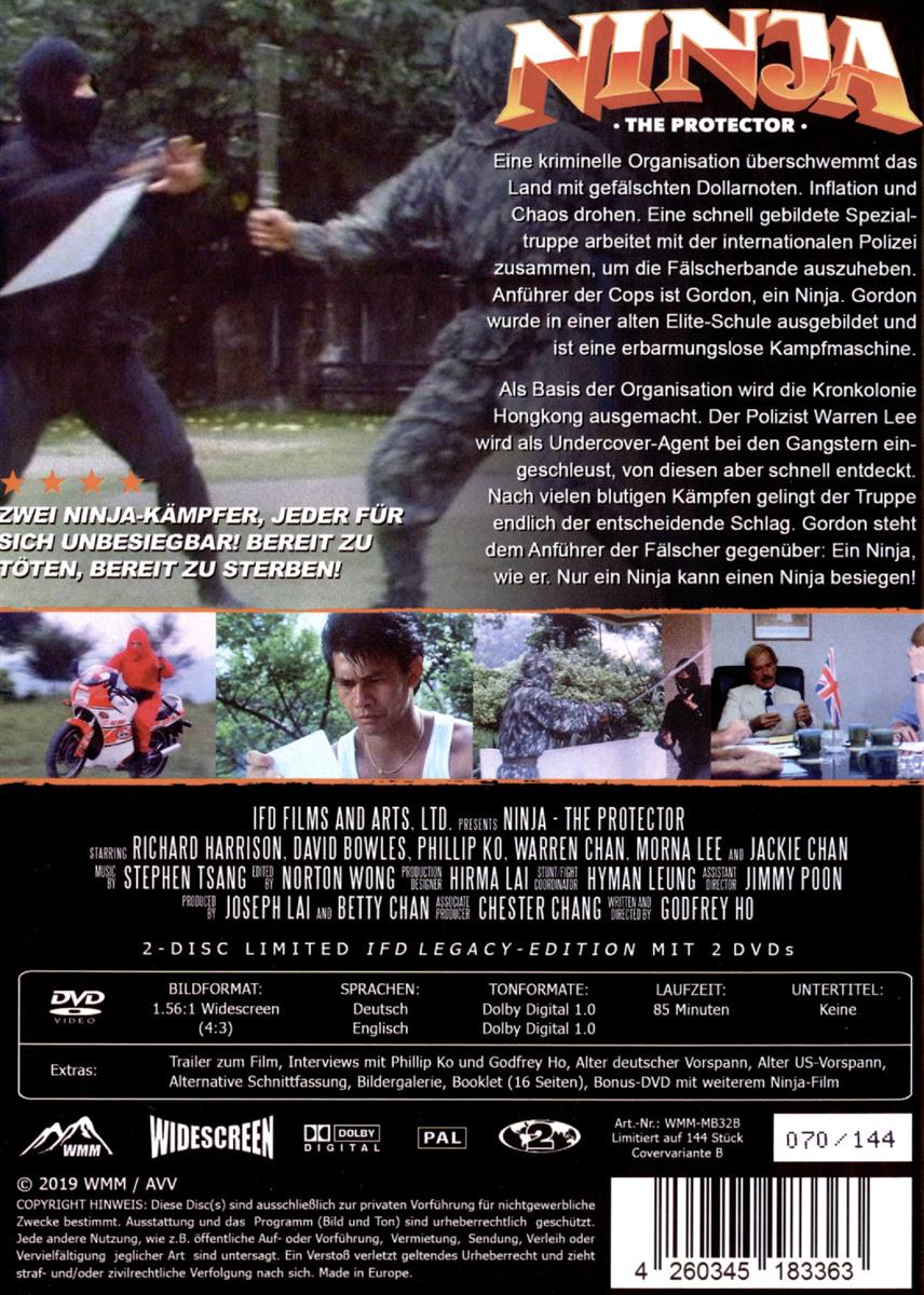 Enthält: - IFD Legacy-Edition - Limitiertes Mediabook - Neuer Transfer vom Original IFD Master - 16-seitiges Booklet über Ninja-Filme und den Ninja-Hype der 80er - Interview mit Phillip Ko - Alternative Schnittfassung - Alter deutscher Vorspann - Alter US-Vorspann - Trailer zum Film - Bildergalerie - Inkl. Bonus-DVD mit weiterem Ninja-Film