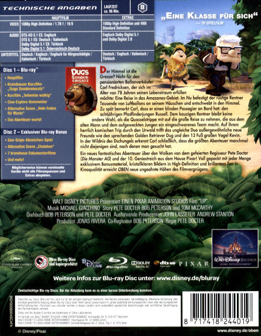 Der Himmel ist die Grenze? Nicht für den pensionierten Ballonverkäufer Carl Fredricksen, der sich im Alter von 78 Jahren seinen Lebenstraum erfüllen möchte: Eine Reise in das Amazonas-Gebiet. Im Nu befestigt der rüstige Rentner Tausende von Luftballons an seinem Häuschen und entschwebt in den Himmel. Zu spät bemerkt Carl, dass er einen blinden Passagier an Bord hat: den achtjährigen Pfadfinderjungen Russell. Dem kauzigen Rentner bleibt keine andere Wahl, als die Quasselstrippe mit auf die große Reise zu nehmen, die aus dem alten Mann und dem aufgeweckten Jungen ein eingeschworenes Team macht. Auf ihrem herrlich komischen Trip durch den Urwald trifft das ungleiche Duo außergewöhnliche neue Freunde wie den sprechenden Golden Retriever Dug und den 13 Fuß großen Vogel Kevin. In der Wildnis des Dschungels erkennt Carl schließlich, dass die größten Abenteuer manchmal nicht diejenigen sind, nach denen man gesucht hat.