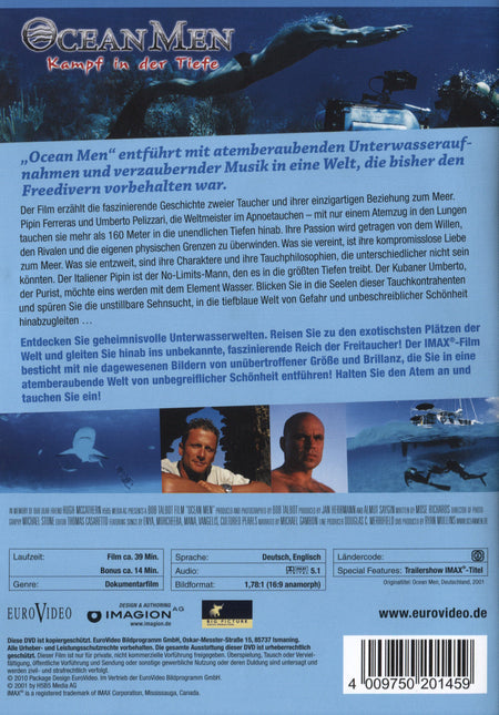 "Ocean Men" entführt mit atemberaubenden Unterwasseraufnahmen und verzaubernder Musik in eine Welt, die bisher den Freedivern vorbehalten war. Der Film erzählt die faszinierende Geschichte zweier Taucher und ihrer einzigartigen Beziehung zum Meer. Pipin Ferreras und Umberto Pelizzari, die Weltmeister im Apnoetauchen. Mit nur einem Atemzug in den Lungen tauchen sie mehr als 160 Meter in die unendlichen Tiefen hinab. Ihre Passion wird getragen von dem Willen, den Rivalen und die eigenen physischen Grenzen zu überwinden. Blicken Sie in die Seelen dieser Tauchkontrahenten und spüren Sie die unstillbare Sehnsucht, in die tiefblaue Welt von Gefahr und unbeschreiblicher Schönheit hinabzugleiten …