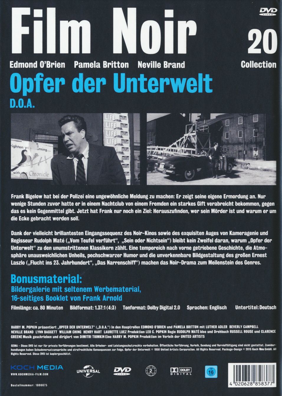 Frank Bigelow hat bei der Polizei eine ungewöhnliche Meldung zu machen: Er zeigt seine eigene Ermordung an. Nur wenige Stunden zuvor hatte er in einem Nachtclub von einem Fremden ein starkes Gift verabreicht´bekommen, gegen das es kein Gegenmittel gibt. Jetzt hat Frank nur noch ein Ziel: Herauszufinden, wer sein Mörder ist und warum er um die Ecke gebracht werden soll.