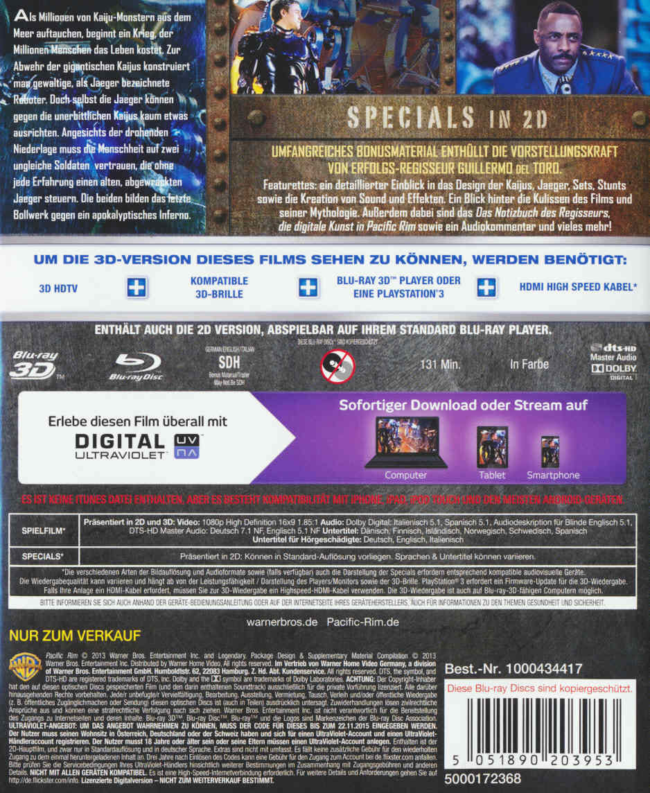 Enthält: Featurettees: ein detaillierter Einblick in das Design der Kaijus, Jaeger, Sets, Stunts sowie die Kreation von Sound und Effekten; Ein Blick hinter die Kulissen des Films und seiner Mythologie; Das Notizbuch des Regisseurs, die digitale Kunst in "Pacific Rim" sowie ein Audiokommentar und vieles mehr!;