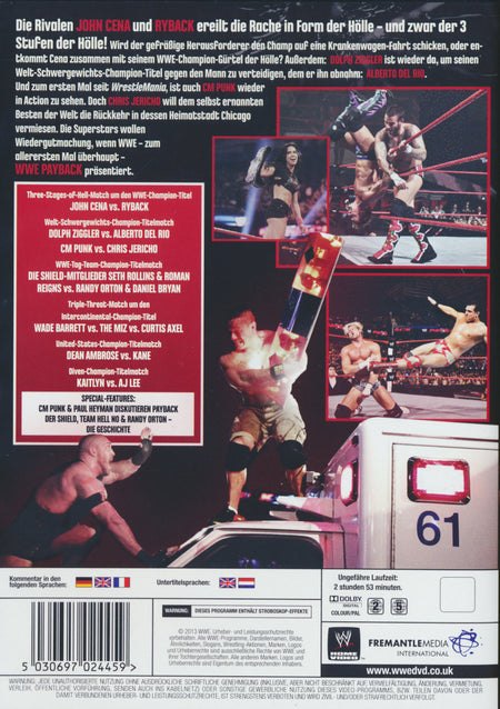 Wird der gefräßige Herausforderer den Champ auf eine Krankenwagen-Fahrt schicken, oder entkommt Cena zusammen mit seinem WWE-Champion-Gürtel der Hölle? Außerdem: Dolph Ziggler ist wieder da, um seinen Welt-Schwergewichts-Champion-Titel gegen den Mann zu verteidigen, dem er ihn abnahm: Alberto del Rio. Und zum ersten Mal seit WrestleMania ist auch CM Punk wieder in Action zu sehen. Doch Chris Jericho will dem selbst ernannten Besten der Welt die Rückkehr in dessen Heimatstadt Chicago vermiesen. Die Superstars wollen Wiedergutmachung, wenn WWE – zum allerersten Mal überhaupt – WWE PAYBACK präsentiert.