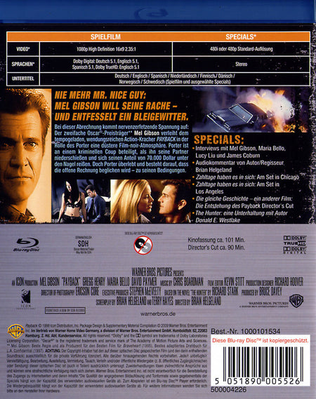 Enthält: Interviews mit Mel Gibson, Maria Bello, Lucy Liu und James Coburn; Audiokommentar von Autor/Regisseur Brian Helgeland; Zahltage haben es in sich: Am Set in Chicago; Zahltage haben es in sich: Am Set in Los Angeles; Die gleiche Geschichte - ein anderer Film: Die Entstehung des Payback Director's Cut; The Hunter: eine Unterhaltung mit Autor Donald E. Westlake;