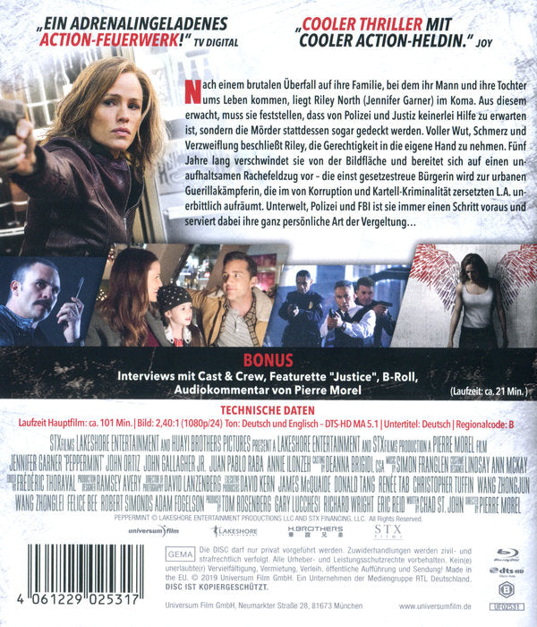 Hochexplosiv, atemberaubend und gnadenlos cool kehrt Jennifer Garner zurück zu ihren Action-Wurzeln und beweist mit PEPPERMINT: ANGEL OF VENGEANCE. Im neuesten Streich von Action-Profi Pierre Morel ("96 Hours") begeistert Garner als unerschrockene Rächerin - smart, schlagkräftig und bemerkenswert durchtrainiert.