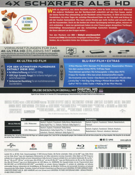 Enthält: 3 Mini-Movies; Tiere können sprechen: Die Schauspieler; Alles über PETS; Friseur für Hunde; Wie man einen Animationsfilm macht; Die Anatomie einer Szene; Das Beste von Snowball; Musikvideo "Lovely Day"; Hot Dog Sing-Along; Minion Brian über Pets; GoPro Pets; Sing Trailer; Making of der Mini-Movies;