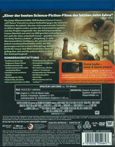 Enthält: Entfallene und erweiterte Szenen; Mythologie der Affen; Andy Serkis, das Genie; Eine neue Generation der Affen; Entstehung einer Filmszene; Konzeptzeichnungen der Charaktere; Revolution des „Motion Capture“- Verfahrens; Komposition der Filmmusik; Die Menschenaffen; Audiokommentar des Regisseurs Rupert Wyatt; Audiokommentar der Drehbuchautoren Rick Jaffa und Amanda Silver; Original Kinotrailer; BD-Live Extras;