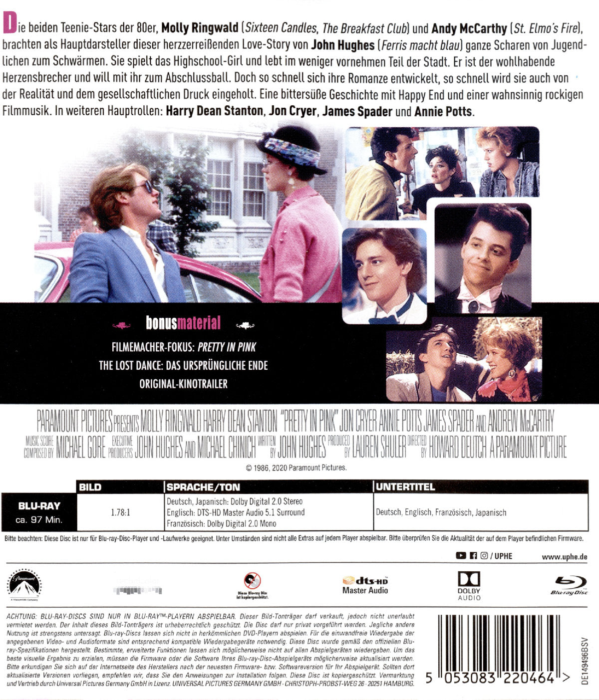 Die beiden Tennisstars der 80er, Molly Ringwald ("Sixteen Candles", "The Breakfast Club") und Andy McCarthy ("St. Elmo´s Fire"), brachten als Hauptdarsteller dieser herzzerreißenden Lovestory von John Hughes ganze Scharen von Jugendlichen zum Schwärmen.Sie spielt das Highschool-Girl und lebt im weniger vornehmen Teil der Stadt. Er ist der wohlhabende Herzensbrecher und will mit ihr zum Abschlussball. Doch so schnell ihre Romanze wächst, wird sie auch von der Realität und dem gesellschaftlichen Druck eingeholt.Eine bittersüße Geschichte mit einem Happy End und einer wahnsinnig rockigen Filmmusik ... In den Hauptrollen: Harry Dean Stanton, Jon Cryer, James Spader und Annie Potts.