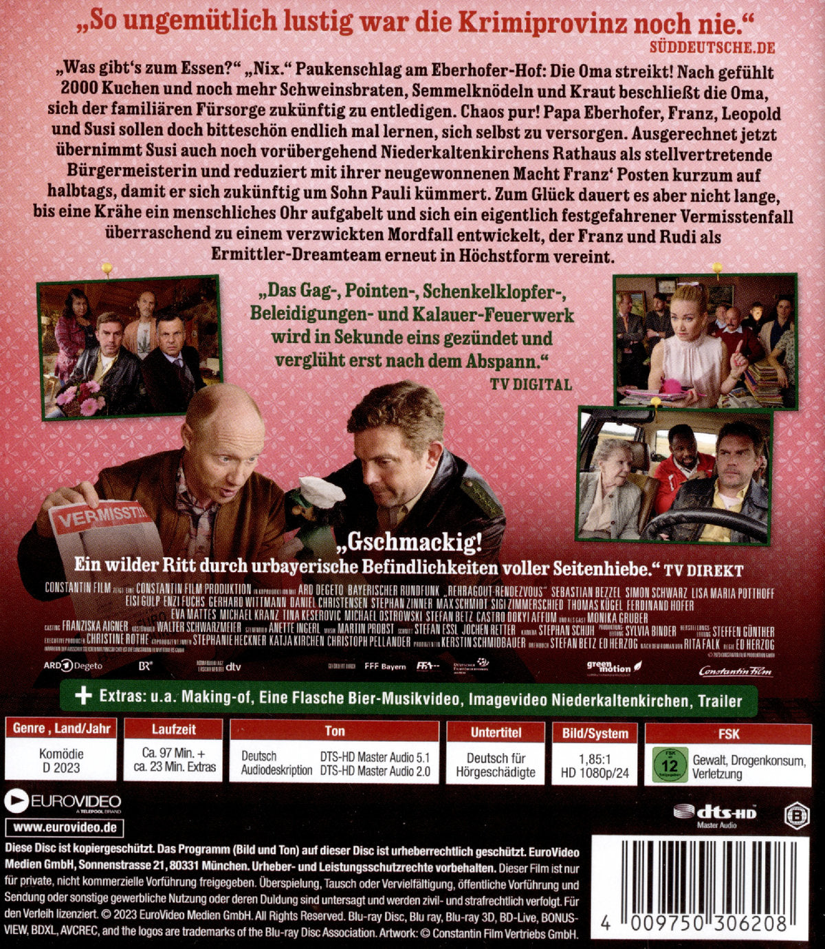 „Was gibt‘s zum Essen?“ „Nix.“ Paukenschlag am Eberhofer-Hof: Die Oma streikt! Nach gefühlt 2000 Kuchen und noch mehr Schweinsbraten, Semmelknödeln und Kraut beschließt die Oma, sich der familiären Fürsorge zukünftig zu entledigen. Chaos pur! Papa Eberhofer, Franz, Leopold und Susi (sollen doch bitteschön endlich mal lernen, sich selbst zu versorgen. Ausgerechnet jetzt übernimmt Susi auch noch vorübergehend Niederkaltenkirchens Rathaus als stellvertretende Bürgermeisterin und reduziert mit ihrer neugewonnenen Macht Franz‘ Posten kurzum auf halbtags, damit er sich zukünftig um Sohn Pauli kümmert. Diese Aktion touchiert die Eberhofer‘sche Männlichkeit empfindlich. Zum Glück dauert es aber nicht lange, bis eine Krähe ein menschliches Ohr aufgabelt und sich ein eigentlich festgefahrener Vermisstenfall überraschend zu einem verzwickten Mordfall entwickelt, der Franz und Rudi als Ermittler-Dreamteam erneut in Höchstform vereint.