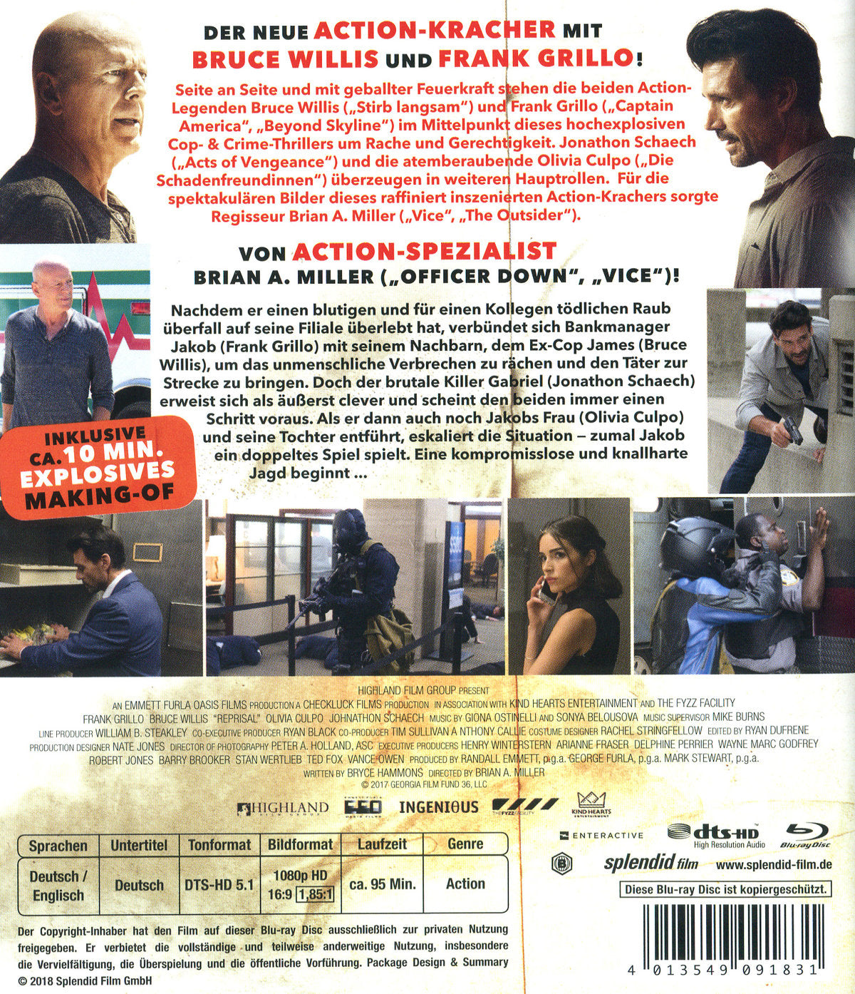 Nachdem er einen brutalen Bankraub überlebt hat, arbeitet Jacob (Grillo) mit seinem Ex-Cop-Nachbarn James (Bruce Willis) zusammen, um den rücksichtslosen, brutalen, maskierten Dieb aufzuspüren und den Überfall zu rächen. Um seiner diabetiskranken Tochter eine Behandlung zu ermöglichen, spielt Jacob ein doppeltes Spiel, bei dem er und seine Familie in das Fadenkreuz eines Mörders geraten. James (Bruce Willis) hat seine eigene Methode um mit diesen Problemen fertig zu werden, eine kompromisslose und knallharte Jagd beginnt ...