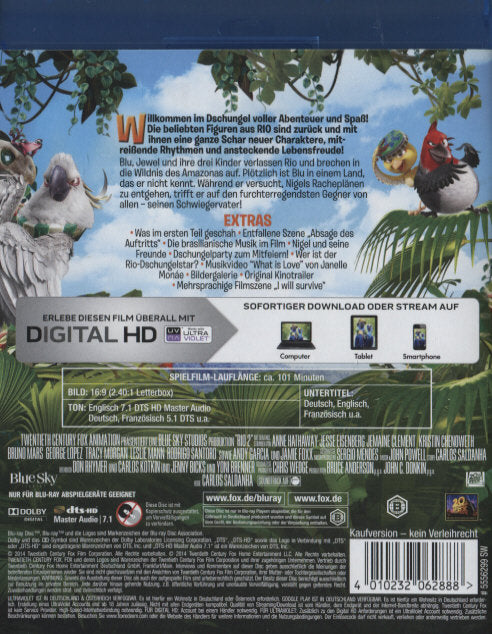 Willkommen im Dschungel voller Abenteuer und Spaß! Die beliebten Figuren aus RIO sind zurück und mit ihnen eine ganze Schar neuer Charaktere, mitreißende Rhythmen und ansteckende Lebensfreude! Blu, Jewel und ihre drei Kinder verlassen Rio und brechen in die Wildnis des Amazonas auf. Plötzlich ist Blu in einem Land, das er nicht kennt. Während er versucht, Nigels Racheplänen zu entgehen, trifft er auf den furchterregendsten Gegner von allen – seinen Schwiegervater!