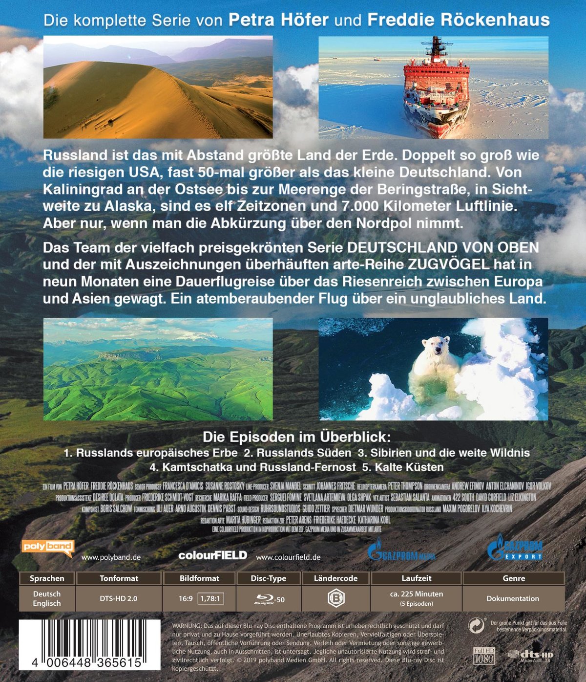 Russland ist das mit Abstand größte Land der Erde. Doppelt so groß wie die riesigen USA, fast 50-mal größer als das kleine Deutschland. Von Kaliningrad an der Ostsee bis zur Meerenge der Beringstraße, in Sichtweite zu Alaska, sind es 11 Zeitzonen und 7.000 Kilometer Luftlinie. Aber nur, wenn man die Abkürzung über den Nordpol nimmt. Das Team der vielfach preisgekrönten Serie DEUTSCHLAND VON OBEN und der mit Auszeichnungen überhäuften arte-Reihe ZUGVÖGEL hat in neun Monaten eine Dauerflugreise über das Riesenreich zwischen Europa und Asien gewagt. Ein atemberaubender Flug über ein unglaubliches Land.