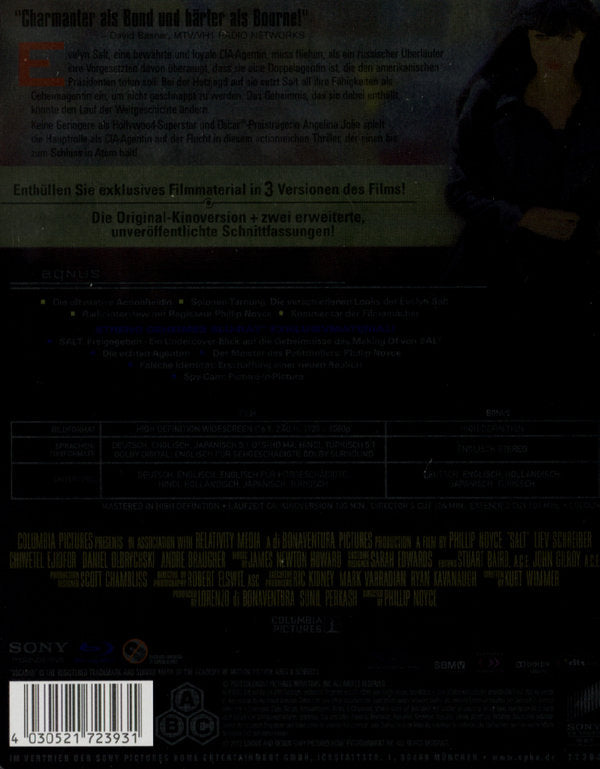 Enthält: Die ultimative Actionheldin; Spionen-Tarnung: Die verschiedenen Looks der Evelyn Salt; Radiointerview mit Regisseur Phillip Noyce; Kommentar der Filmemeacher; SALT: Freigegeben - Ein Undercover-Blick auf die Geheimnisse des Making of von Salt; Die echten Agenten; Der Meister des Politthrillers: Phillip Noyce; Falsche Identität: Erschaffung einer neuen Realität; Spy-Cam: Picture-in-Picture;
