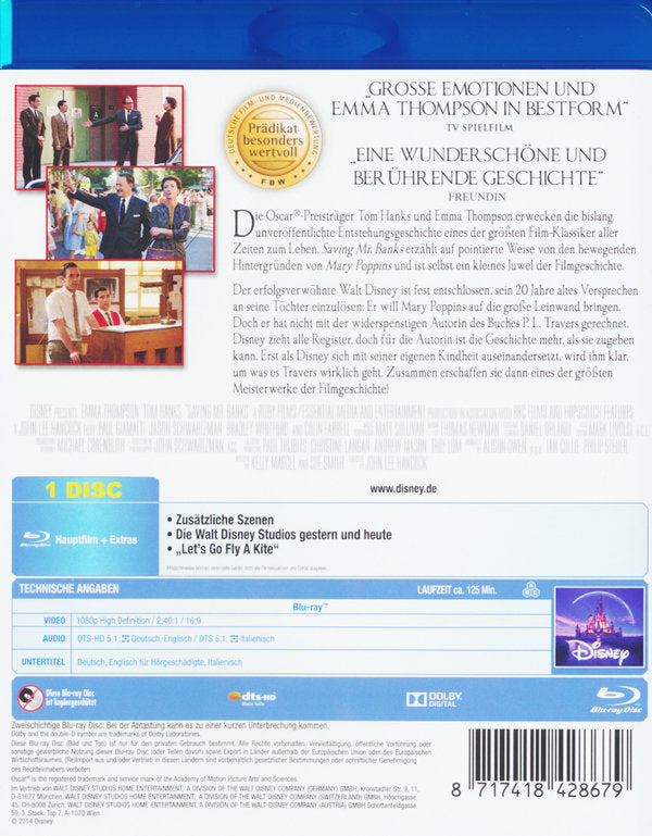 Die Oscar�-Preistr�ger Tom Hanks und Emma Thompson erwecken die bislang unver�ffentlichte Entstehungsgeschichte eines der gr��ten Film-Klassiker aller Zeiten zum Leben. Saving Mr. Banks erz�hlt auf pointierte Weise von den bewegenden Hintergr�nden von Mary Poppins und ist selbst ein kleines Juwel der Filmgeschichte. Der erfolgsverw�hnte Walt Disney ist fest entschlossen, sein 20 Jahre altes Versprechen an seine T�chter einzul�sen: Er will Mary Poppins auf die gro�e Leinwand bringen. Doch er hat nicht mit der widerspenstigen Autorin des Buches P. L. Travers gerechnet. Disney zieht alle Register, doch f�r die Autorin ist die Geschichte mehr, als sie zugeben kann. Erst als Disney sich mit seiner eigenen Kindheit auseinandersetzt, wird ihm klar, um was es Travers wirklich geht. Zusammen erschaffen sie dann eines der gr��ten Meisterwerke der Filmgeschichte!