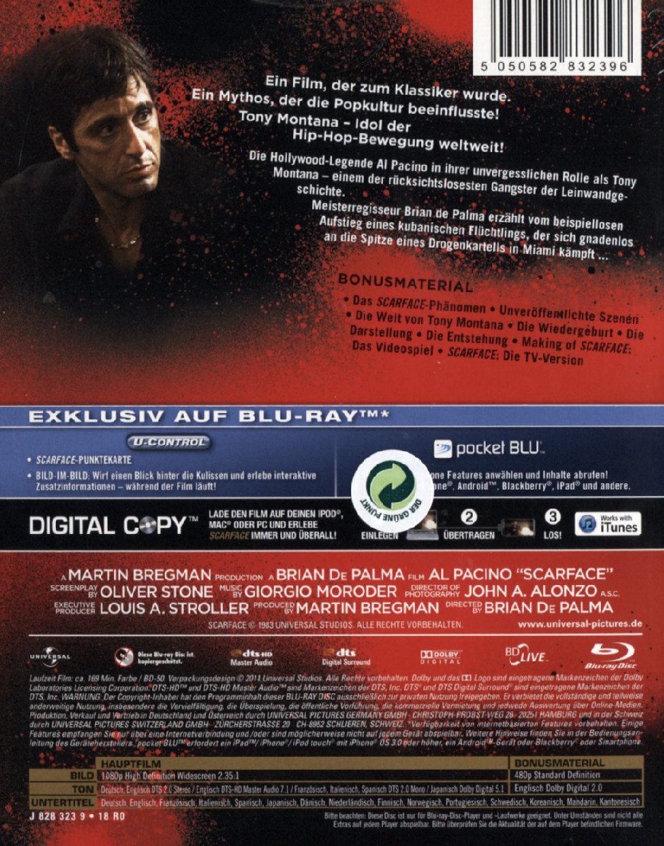 Enthält: Das Scarface-Phänomen; Unveröffentliche Szenen; Die Welt von Tony Montana; Die Wiedergeburt; Die Darstellung; Die Enstehung; Making of Scarface: Das Videospiel; Scarface: Die TV-Version;