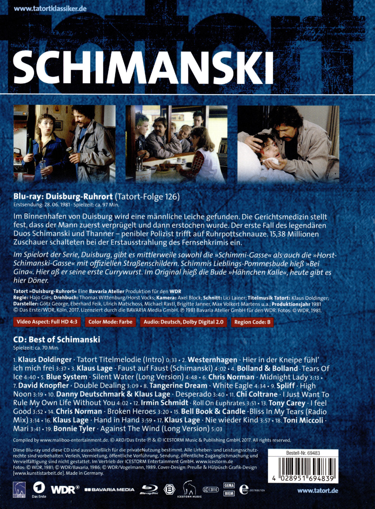 Die erste Folge der Schimanski Tatort Reihe wurde nun aufwändig neu abgetastet und restauriert. In 4kK erscheint die erste Schimanski Folge "Duisburg-Ruhrort" auf Bu-ray in Kombination mit der "Best of Schimanski" CD Compilation in einem interessanten Mediabook.