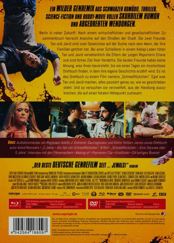 Enthält: 2-Disc Limited Collector’s Edition im Mediabook mit Blu-ray und DVD sowie 24-seitigem Booklet // Bonus: Audiokommentar von Regisseur Adolfo J. Kolmerer; Gastregisseur und Editor William James sowie Drehbuchautor Arend Remmers // „2 Jahre – Am Set von Schneeflöckchen“ // „Schneeflöckchen – Eine Odyssee über 5 Jahre“ // Making-of // Premieren-Clip // Kinotrailer
