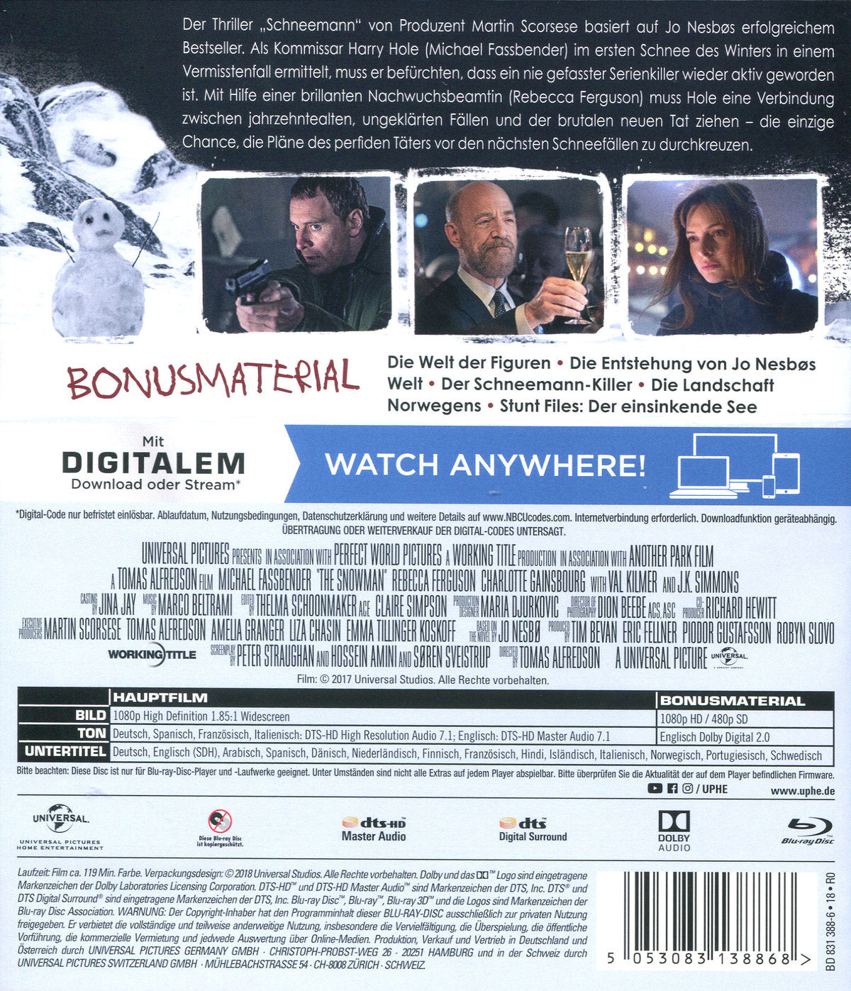 Junge Mütter verschwinden spurlos - was bleibt, ist ein Schneemann in ihren Vorgärten… Kommissar Harry Hole (Michael Fassbender) recherchiert in einem Labyrinth aus Verdächtigungen und falschen Fährten nach ihrem Mörder. Die brutalen Morde müssen enden, noch bevor der nächste Schnee fällt. Zusammen mit der Nachwuchsbeamtin Katrine Bratt (Rebecca Ferguson) vermutet der eigenwillige Einzelgänger einen nie gefassten Serienmörder hinter den Verbrechen. Als seine Freundin Rakel ins Visier des Killers gerät, entwickelt sich ein mörderisches Duell.
