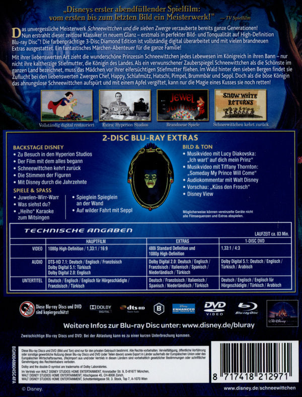 Enthält: Disney View; Schneewittchen kehrt zurück; Musikvideo mit Lucy Diakovska: "Ich wart´auf dich mein Prinz"; Musikvideo mit Tiffany Thornton: "Someday my prince will come"; Audiokommentar mit Walt Disney; Vorschau: "Küss den Frosch"; Spiel & Spass "Juwelen-Wirr-Warr"; Spiel & Spass "Was siehst du?"; Spiel & Spass "Spieglein, Spieglein an der Wand"; Zu Besuch in den Hyperion Studios - "Dokumentationen und virtueller Rundgang durch die Hyperion Studios"; Der Film mit dem alles begann; Die Stimmen der Figuren; Mit Disney durch die Jahrzehnte; Auf wilder Fahrt mit Seppl; "Heiho" Karoke zum Mitsingen; Musikvideo von Lucy Diakovska: "Ich wart´auf dich mein Prinz"; Audiokommentar mit Walt Disney;