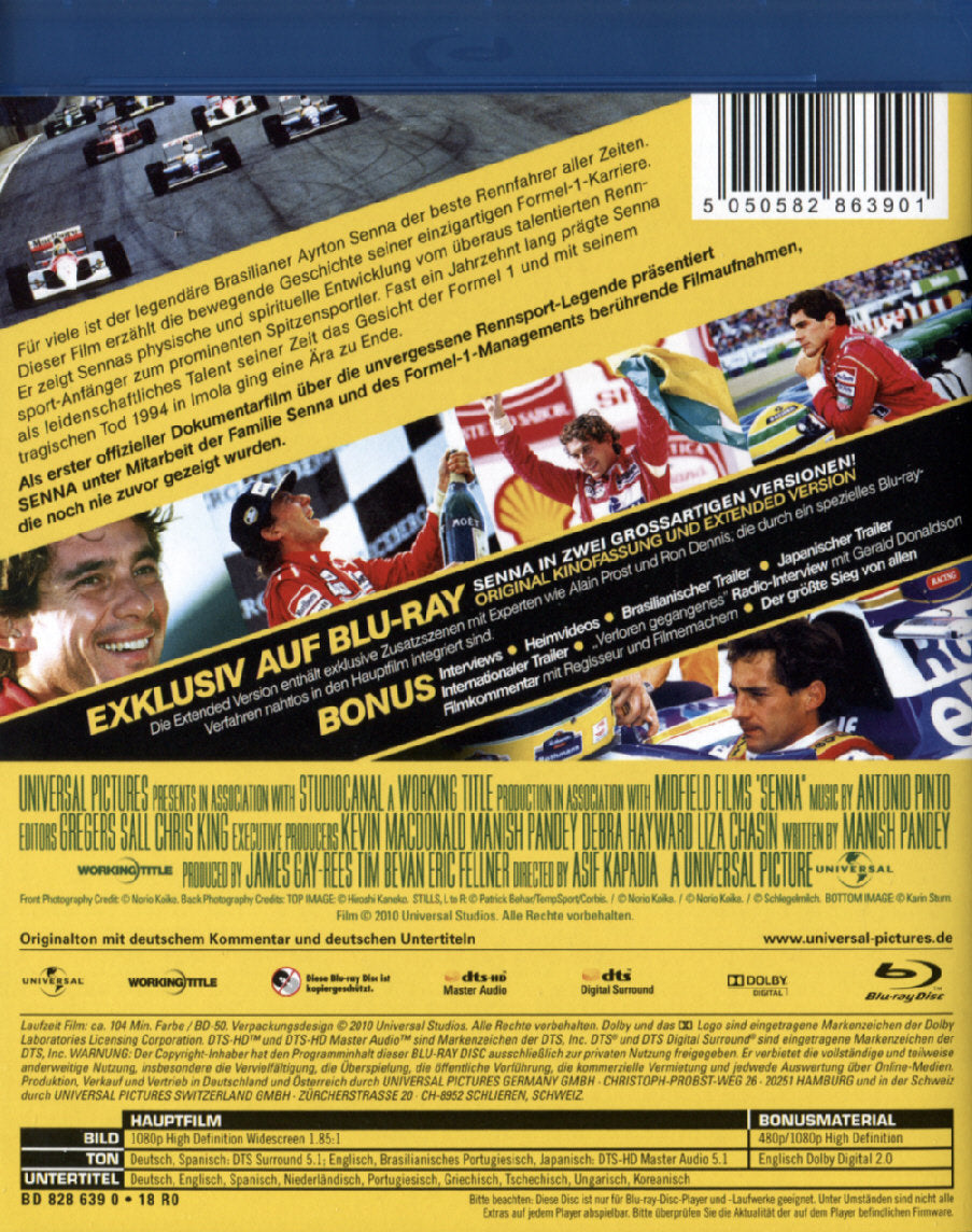 Enthält: Senna in zwei grossartigen Versionen: Original Kinofassung und Extended Version. Die Extended Version enthält exklusive Zusatzszenen mit Experten wie Alain Prost und Ron Dennis, die durch ein spezielles Blu-ray-Verfahren nahtlos in den Hauptfilm integriert sind; Filmkommentar mit Regisseur und Filmemachern; Der größte Sieg von allen; Interviews; Heimvideos; "Verloren gegangenes" Radio-Interview mit Gerald Donaldson; Brasilianischer Trailer; Japanischer Trailer; Internationale Trailer;