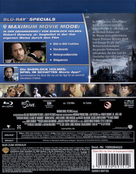 In "Sherlock Holmes: Spiel im Schatten" spielt Robert Downey Jr. erneut den berühmtesten Detektiv der Welt - unterstützt von Jude Law als seinem Freund und Kollegen Dr. Watson. Bisher war niemand in der Lage, Holmes' Scharfsinn zu überbieten... bis jetzt. Der geniale Verbrecher Professor Moriarty treibt ein undurchsichtiges Spiel und ist Holmes intellektuell mehr als gewachsen - durch seine skrupellose Bösartigkeit könnte er dem legendären Detektiv sogar überlegen sein. Als die Spannungen in Europa zunehmen und sich Mord und Chaos seuchenartig ausbreiten, können nur Holmes und Watson Moriartys finstere Vorhaben stoppen, das dem Lauf der Geschichte eine völlig andere Richtung zu geben droht.