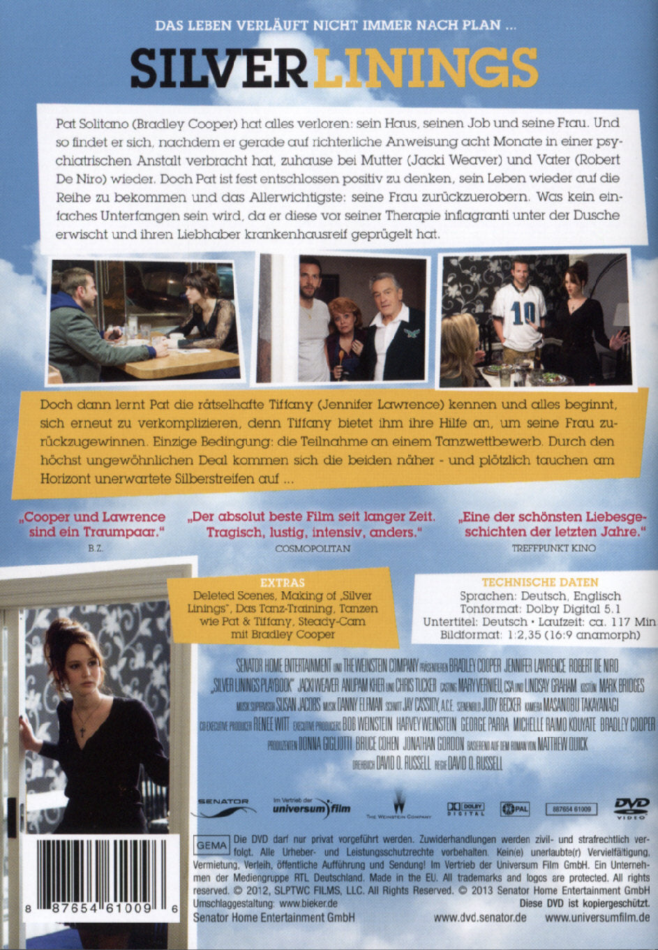 Pat Solatano (Bradley Cooper) hat alles verloren: sein Haus, seinen Job und seine Frau. Und so findet er sich, nachdem er gerade auf gerichtliche Anweisung acht Monate in einer psychiatrischen Anstalt verbracht hat, plötzlich zuhause bei Mutter (Jacki Weaver) und Vater (Robert de Niro) wieder. Pat ist fest entschlossen, positiv zu denken und damit sein Leben wieder auf die Reihe zu bekommen und seine Frau zurückzuerobern. Doch dann lernt Pat die rätselhafte Tiffany (Jennifer Lawrence) kennen und alles beginnt, sich erneut zu verkomplizieren, denn Tiffany bietet ihm ihre Hilfe bei der Rückeroberung seiner Frau an. Einzige Bedingung: ein Tanzkurs. Im Zuge ihres ungewöhnlichen Deals kommen sich die beiden auf überraschende Weise näher - und plötzlich tun sich am Horizont unerwartete Silberstreifen auf...