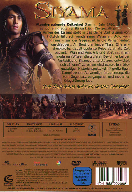 Siam im Jahr 1766: Es tobt ein grausamer Bürgerkrieg. Die gewaltige Armee des Kaisers stößt in das kleine Dorf Siyama vor. Plötzlich fällt auf wundersame Weise ein Auto vom Himmel - aus der Gegenwart in die Vergangenheit geschleudert. An Bord drei junge Thais. Eine eindrucksvolle, visuell opulente Reise durch die Zeit beginnt. Während Ana, Gib und Boat mit ihrem modernen Wissen die tapferen Bewohner bei der Verteidigung Siyamas unterstützen, entwickelt sich "Siyama" zu einem eindrucksvollen, bildgewaltigen Historienspektakel mit großartigen Kampfszenen.