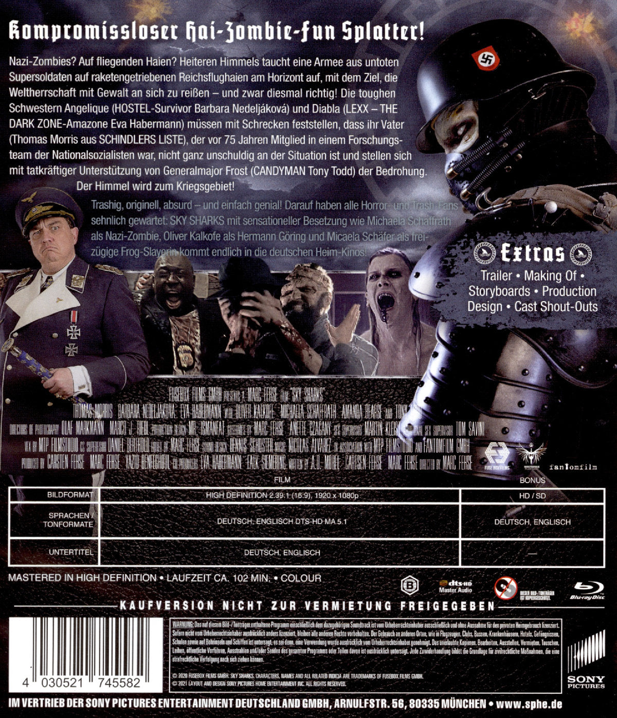Trashig, originell, absurd - und einfach genial! Darauf haben alle Horror- und Trash-Fans sehnlich gewartet: SKY SHARKS mit sensationeller Besetzung wie Michaela Schaffrath als Nazi-Zombie, Oliver Kalkofe als Hermann Göring und Micaela Schäfer als freizügige Frog-Slayerin kommt endlich in die deutschen Heim-Kinos!