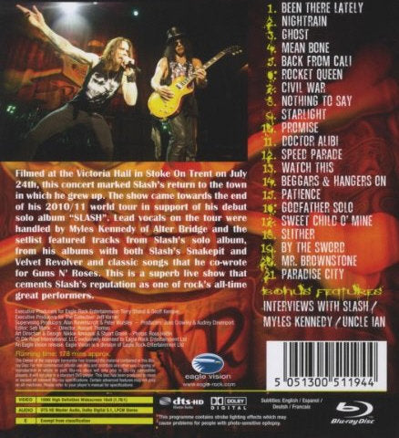 Filmed at the Victoria Hall in Stoke On Trent on July 24th, this concert marked Slash's return to the town in which he grew up. The show came towards the end of his 2010/11 world tour in support of his debut solo album "Slash". Lead vocals on the tour were handled by Myles Kennedy of Alter Bridge and the setlist featured tracks from his solo album, from his albums with both Slash's Snakepit and Velvet Revolver and classic songs that he co-wrote for Guns'n'Roses.