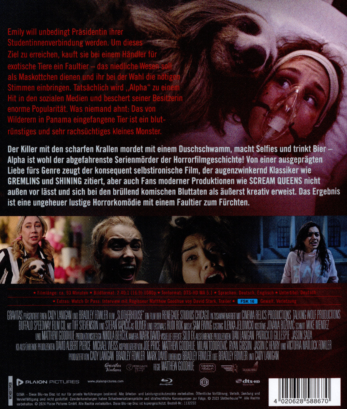 Der Killer mit den scharfen Krallen mordet mit einem Duschschwamm, macht Selfies und trinkt Bier - Alpha ist wohl der abgefahrenste Serienmörder der Horrorfilmgeschichte! Von einer ausgeprägten Liebe fürs Genre zeugt der konsequent selbstironische Film, der augenzwinkernd Klassiker wie GREMLINS und SHINING zitiert, aber auch Fans moderner Produktionen wie SCREAM QUEENS nicht außen vor lässt und sich bei den brüllend komischen Bluttaten als äußerst kreativ erweist. Das Ergebnis ist eine ungeheuer lustige Horrorkomödie mit einem Faultier zum Fürchten.