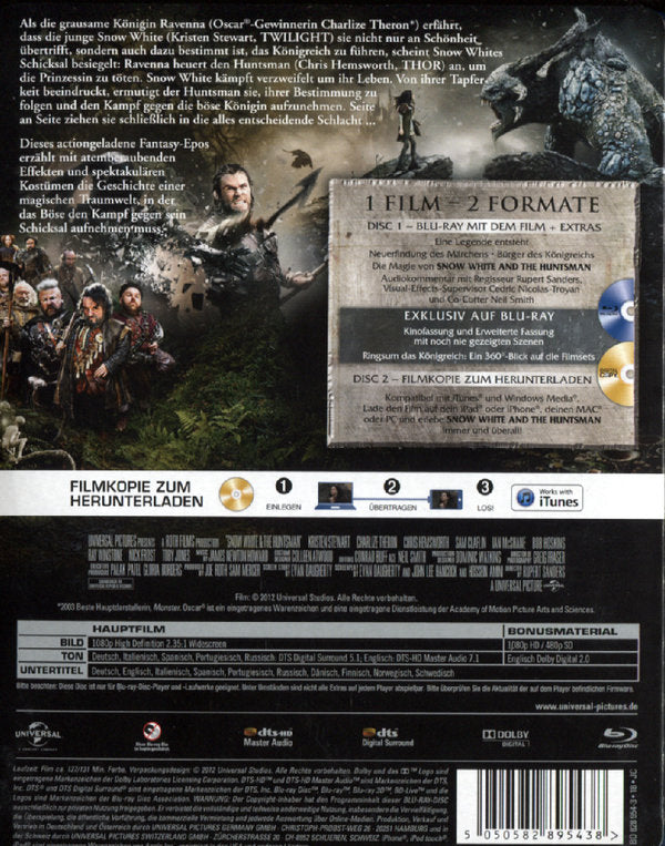 Enthält: Eine neue Legende ensteht; Neuerfindung des Märchens; Bürger des Königreichs; Die Magie von "Snow White and the Huntsman"; Audiokommentar mit Regisseur Rupert Sanders; Visua-Effect-Supervisor Cedric Nicolas-Troyan und Co-Cutter Neil Smith; Trailer; Kinofassung und Erweiterte Fassung mit noch nie gezeigten Szenen; Ringsum das Königreich: Ein 360° -Blick auf die Filmsets;