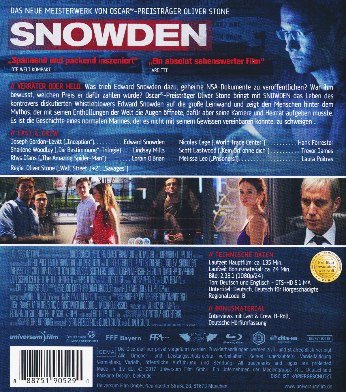 Der Meister des amerikanischen Kinos, Oliver Stone ("Nixon", "JFK - Tatort Dallas", "Platoon"), verfilmte die Geschichte Edward Snowdens, der eine der brisantesten gegenwärtigen politischen Affären ins Rollen brachte und trotz Lebensgefahr auf das Ausmaß der Überwachung unserer Gesellschaft aufmerksam machte.