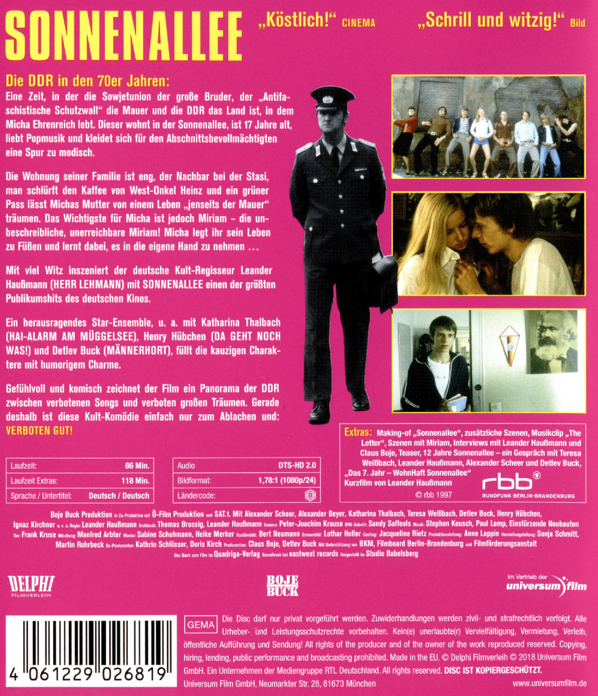 Die DDR in den 70er-Jahren. Eine Zeit, in der es noch Abschnittsbevollmächtigte gibt, die Sowjetunion der große Bruder, der Klassenfeind der Rest der Welt, der Antifaschistische Schutzwall die Mauer und die DDR das Land ist, in dem Micha Ehrenreich lebt. Er wohnt in einer Straße, deren längeres Ende im Westen und deren kürzeres Ende im Osten liegt: die Sonnenallee. Micha ist 17, er liebt Pop-Musik und Coca Cola, sein Berufsziel ist es, Pop-Star zu werden und darum kleidet er sich für den Abschnittsbevollmächtigten eine Spur zu modisch. Die Wohnung ist eng, der Nachbar bei der Stasi und auch die Erwachsenen lassen nichts unversucht, sich ein paar Annehmlichkeiten anzueignen: Man schlürft den Kaffee von West-Onkel Heinz, einem ewigen Besserwisser und Schmuggler vor dem Herrn, genießt die Nylons aus selbiger Quelle und ein grüner Pass lässt Michas Mutter um Jahre altern und sogar von einem Leben “jenseits der Mauer“ träumen? Osten hin, Westen her: Das Wichtigste für Micha ist Miriam, die unbeschreibliche, sagenhafte, unerreichbare Miriam. Micha legt ihr sein Leben zu Füßen und lernt dabei, es in die eigene Hand zu nehmen.