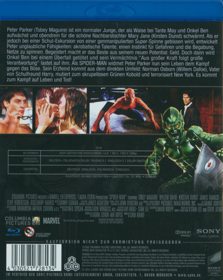 Peter Parker ist ein normaler Junge, der als Waise bei Tante May und Onkel Ben aufwächst und obendrein für die schöne Nachbarstochter Mary Jane schwärmt. Als er jedoch bei einer Schul-Exkursion von einer genmanipulierten Super-Spinne gebissen wird, entwickelt Peter plötzlich unglaubliche Fähigkeiten: Phantastische akrobatische Talente, einen übernatürlichen Instinkt für Gefahren und die Begabung, Netze zu spinnen. Begeistert macht er das Beste aus seinem neuen Potential: Geld. Doch dann wird Onkel Ben bei einem Überfall getötet und sein Vermächtnis "Aus großer Kraft folgt große Verantwortung" lastet schwer auf ihm. Als Spider-Man widmet Peter Parker nun sein Leben dem Kampf gegen das Böse. Sein Erzfeind kommt aus dem direkten Umfeld: Norman Osborn, Vater von Schulfreundin Harry, mutiert zum skrupellosen Grünen Kobold und terrorisiert New York. Auch Tante May und Mary Jane sind nicht mehr sicher. Es kommt zum Kampf auf Leben und Tod!