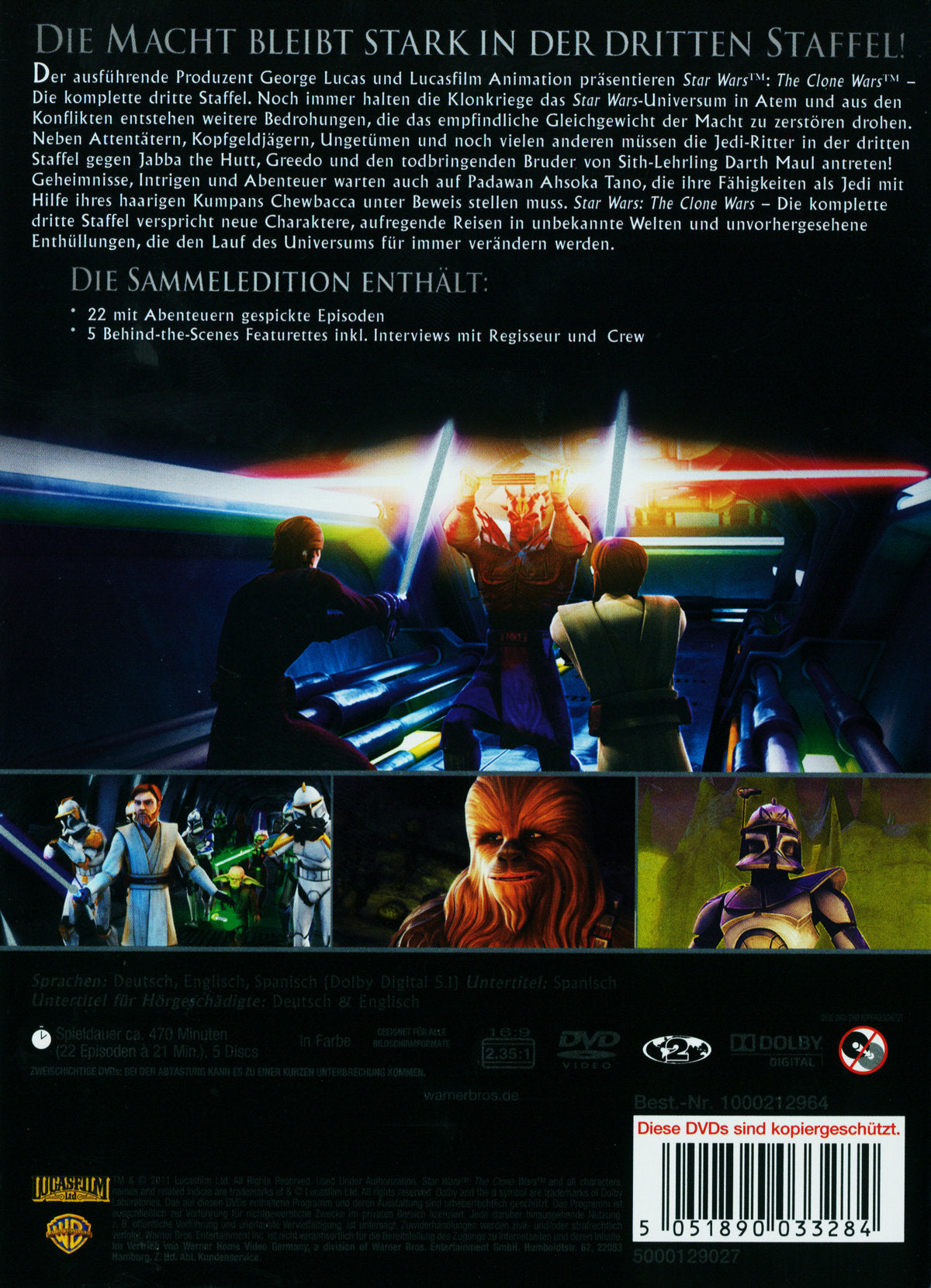 Die Macht bleibt stark in der dritten Staffel! Enthält alle 22 Episoden Der ausführende Produzent George Lucas und Lucasfilm Animation präsentieren Star Wars: The Clone Wars - Die komplette dritte Staffel. Noch immer halten die Klonkriege das Star Wars Universum in Atem und aus den Konflikten entstehen weitere Bedrohungen, die das empfindliche Gleichgewicht der Macht zu zerstören drohen. Neben Attentätern, Kopfgeldjägern, Ungetümen und noch vielen mehr müssen die Jedi Ritter in der dritten Staffel gegen Jabba the Hutt, Greedo und den todbringenden Bruder von Sith-Lehrling Darth Maul antreten! Geheimnisse, Intrigen und Abenteuer warten auch auf Padawan Ahsoka Tano, die ihre Fähigkeiten als Jedi mit Hilfe ihres haarigen Kumpans Chewbacca unter Beweis stellen muss.