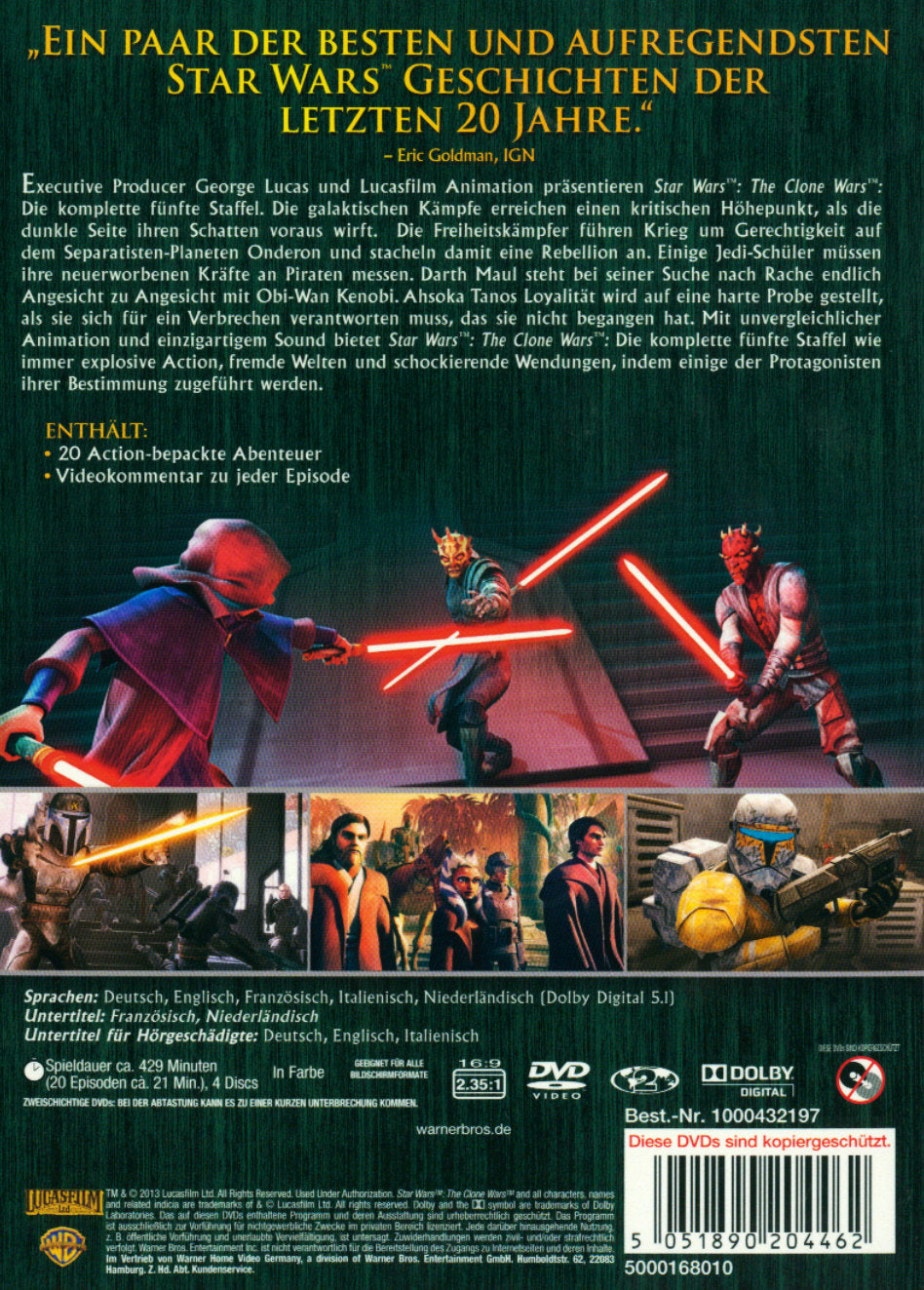 Die galaktischen Kämpfe erreichen einen kritischen Höhepunkt, als die Dunkle Seite ihren Schatten voraus wirft. Die Freiheitskämpfer führen Krieg um Gerechtigkeit auf dem Separatisten-Planeten Onderon und stacheln damit eine Rebellion an. Einige Jedi-Schüler müssen ihre neuerworbenen Kräfte an Piraten messen. Darth Maul steht bei seiner Suche nach Rache endlich Angesicht zu Angesicht mit Obi-Wan Kenobi. Ahsoka Tanos Loyalität wird auf eine harte Probe gestellt, als sie sich für ein Verbrechen verantworten muss, das sie nicht begangen hat. Mit unvergleichlicher Animation und einzigartigem Sound bietet Star Wars™: The Clone Wars™: Die komplette fünfte Staffel wie immer explosive Action, fremde Welten und schockierende Wendungen, indem einige der Protagonisten ihrer Bestimmung zugeführt werden.