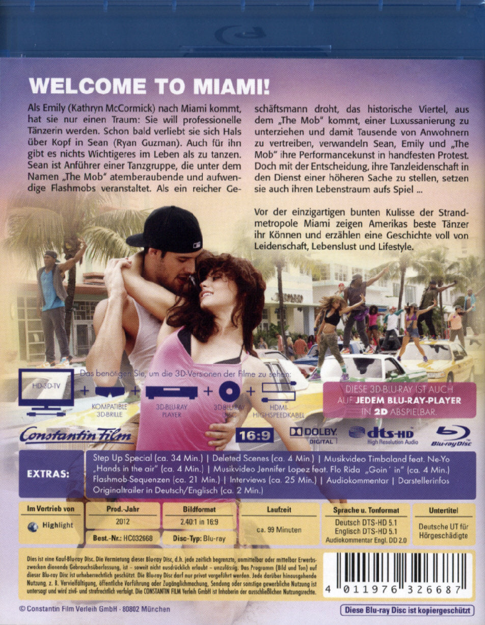 Enthält: Step Up Special (ca. 34 Min.); Musikvideo: Timbaland feat. Ne-Yo "Hands in the air" (ca. 4 Min.); Musikvideo: Jennifer Lopez feat. Flo Rida "Goin ' in" (ca. 4 Min.); Interviews (ca. 8 Min.); Orginaltrailer in Deutsch/Englisch (ca. 2 Min.); Audiokommentar; Darstellerinfos;