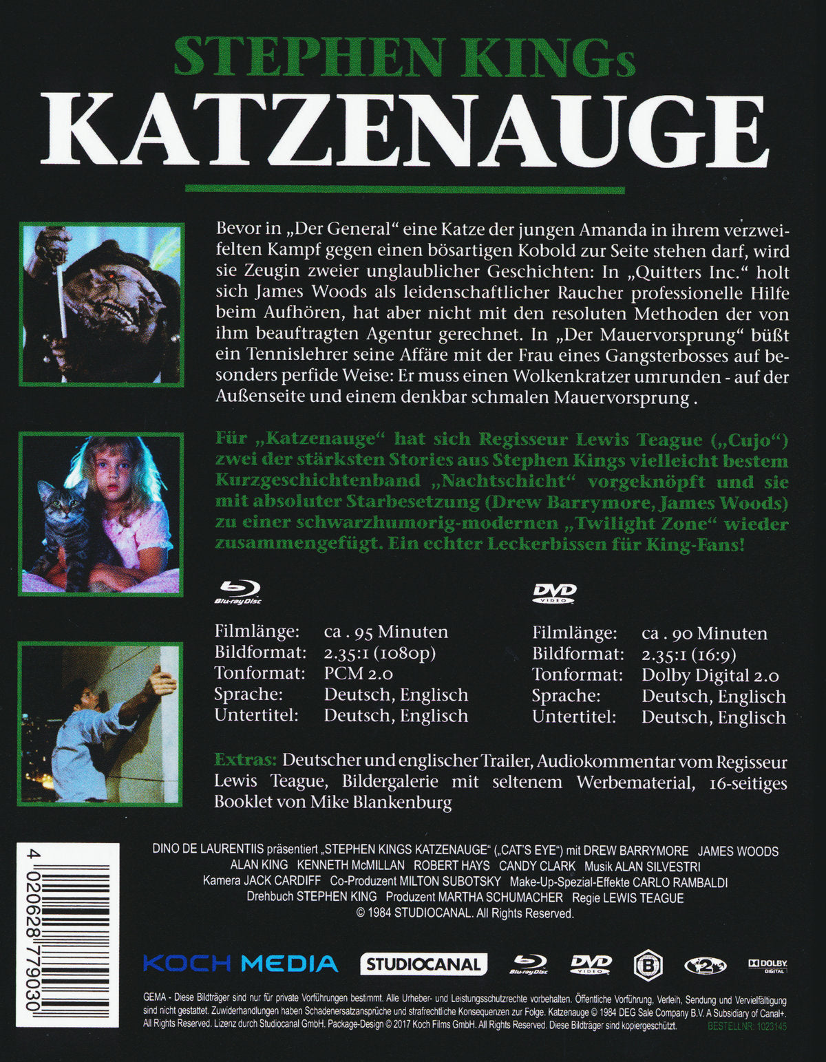Für "Katzenauge" hat sich Regisseur Lewis Teague ("Cujo") zwei der stärksten Stories aus Stephen Kings vielleicht bestem Kurzgeschichtenband "Nachtschicht" vorgeknöpft und sie mit absoluter Starbesetzung (Drew Barrymore, James Woods) zu einer schwarzhumorig- modernen "Twilight Zone" wieder zusammengefügt. Ein echter Leckerbissen für King-Fans, den Koch Films erstmals auch auf Blu-ray zur Veröffentlichung bringt.