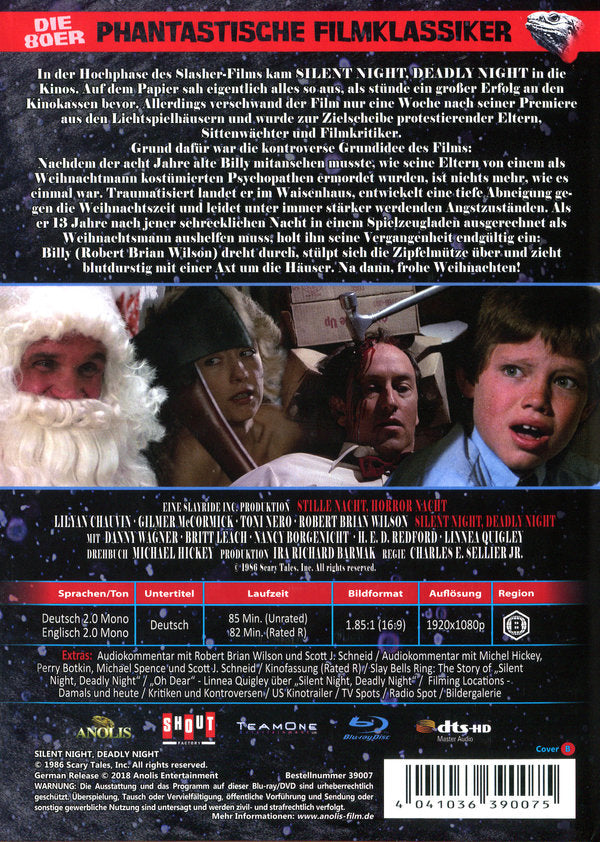 Enthält: Audiokommentar mit Robert Brian Wilson und Scott J. Schneid / Audiokommentar mit Michel Hickey, Perry Botkin, Michael Spence und Scott J. Schneid / Kinofassung (Rated R) / Slay Bells Ring: The Story of „Silent Night, Deadly Night“ / „Oh Dear“ - Linnea Quigley über „Silent Night, Deadly Night“ / Filming Locations -Damals und heute / Kritiken und Kontroversen / US Kinotrailer / TV Spots / Radio Spot / Bildergalerie; Inkl. 24-seitigem Booklet geschrieben von Jonas Hoppe