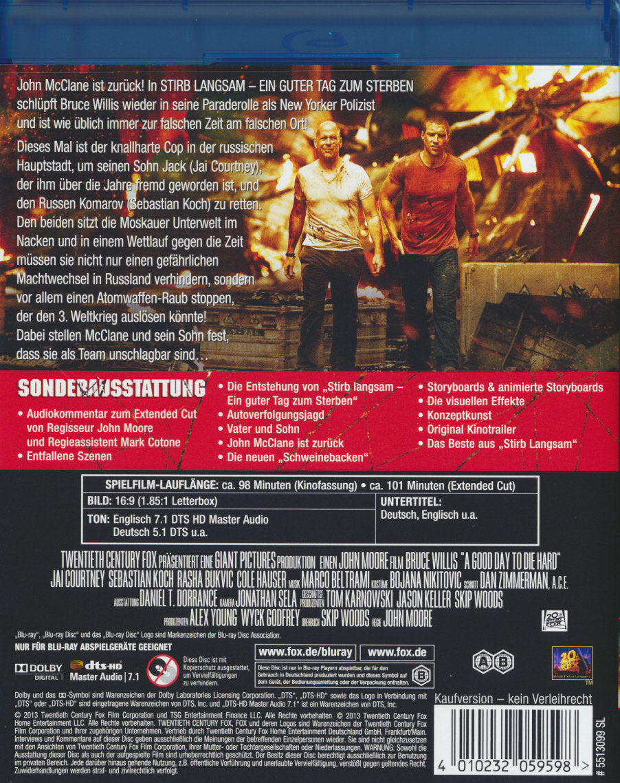 Enthält: Audiokommentarzum Extended Cut von Regisseur John Moore und Regieassistent Mark Cotone; Entfallene Szenen; Die Entstehung von "Stirb langsam - Ein guter Tag zum Sterben"; Autoverfolgungsjagd; Vater und Sohn; John McClane ist zurück; Die neuen Schweinebacken; Storyboards & animierte Storyboards; Die visuellen Effekte; Konzeptkunst; Original Kinotrailer; Das Beste aus "Stirb Langsam";