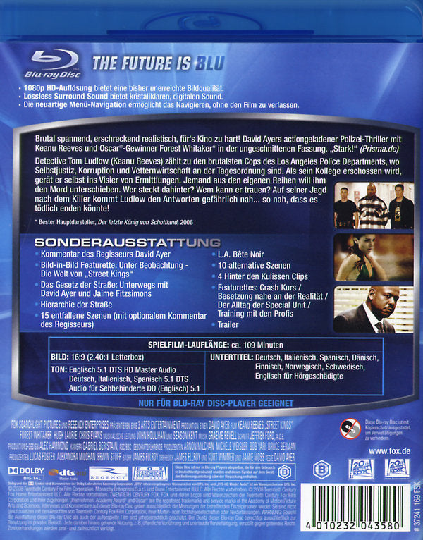 Enthält: Audio für Sehbehinderte in engl. Sprache in DD 5.1; Kommentar des Regisseurs; Unter Beobachtung: Die Welt von Street Kings; Das Gesetz der Straße: Unterwegs mit David Ayer und Jaime Fitzsimons; 15 entfallene Szenen mit optionalem Kommentar des Regisseurs; L.A. Bête Noir; Hierarchie der Straße; 10 alternative Szenen; Hinter den Kulissen; Featurette "Crash Kurs"; Featurette "Besetzung nahe an der Realität"; Featurette "Der Alltag der Special Unit"; Featurette "Training mit den Profis"; Trailer;