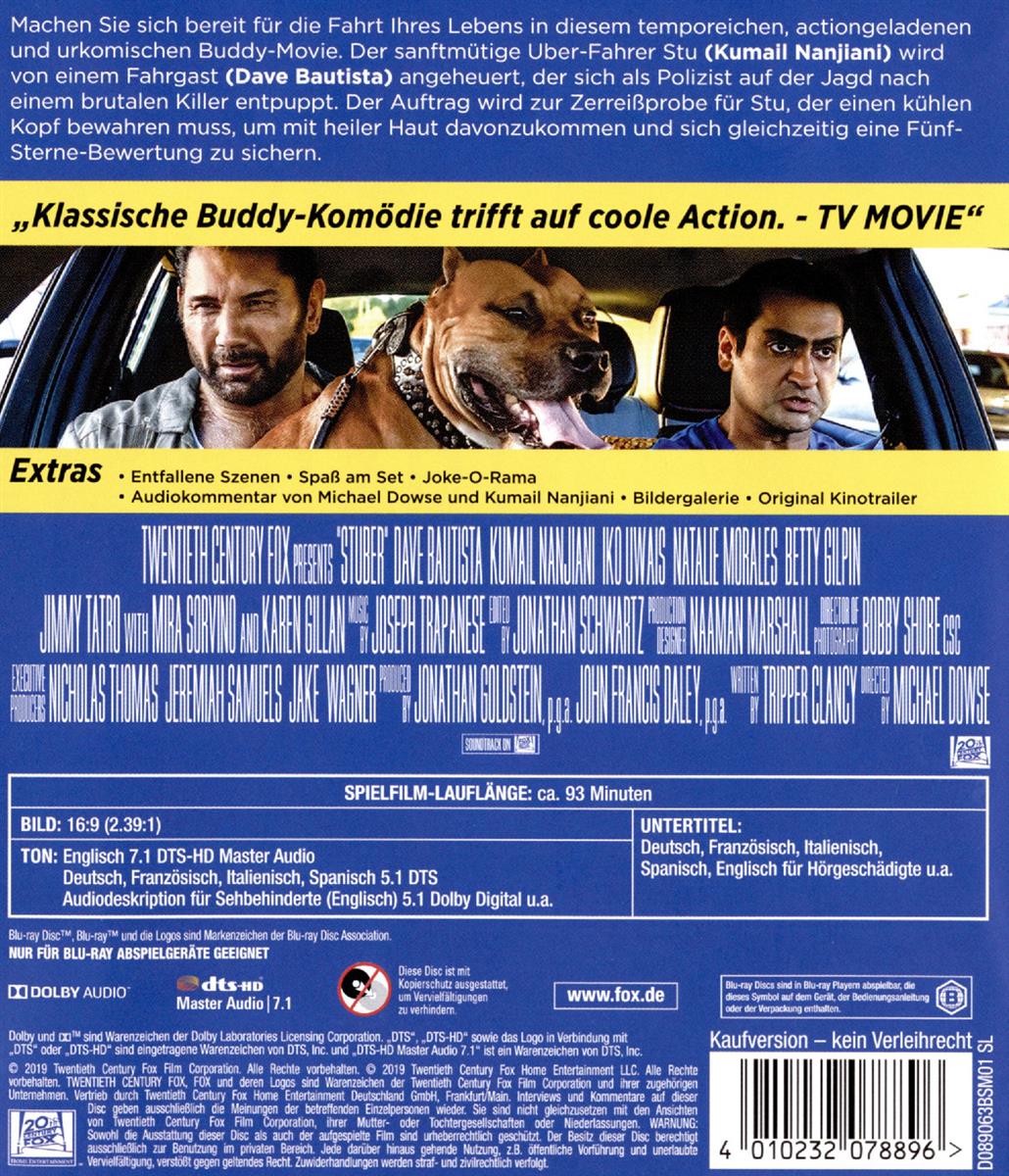 Machen Sie sich bereit f�r die Fahrt Ihres Lebens in diesem temporeichen, actiongeladenen und urkomischen Buddy-Movie. Der sanftm�tige Uber-Fahrer Stu (Kumail Nanjiani) wird von einem Fahrgast (Dave Bautista) angeheuert, der sich als Polizist auf der Jagd nach einem brutalen Killer entpuppt. Der Auftrag wird zur Zerrei�probe f�r Stu, der einen k�hlen Kopf bewahren muss, um mit heiler Haut davonzukommen und sich gleichzeitig eine F�nf-Sterne-Bewertung zu sichern.