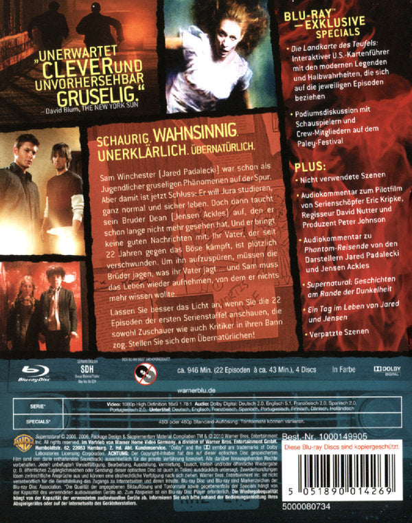 Enthält: Die Landkarte des Teufels: Interaktiver U.S.-Kartenführer mit den modernen Legenden und Halbwahrheiten, die sich auf die jeweiligen Episoden beziehen; Podiumsdiskussion mit Schauspielern und Crew-Mitgliedern auf dem Paley-Festival; Nicht verwendete Szenen; Audiokommentar zum Pilotfilm von Serienschöpfer Eric Kripke, Regisseur David Nutter und Produzent Peter Johnson; Audiokommentar zu Phantom-Reisende von den Darstellern Jared Padalecki und Jensen Ackles; Supernatural: Geschichten am Rande der Dunkelheit; Ein Tag im Leben von Jared und Jensen; Verpatzte Szenen;