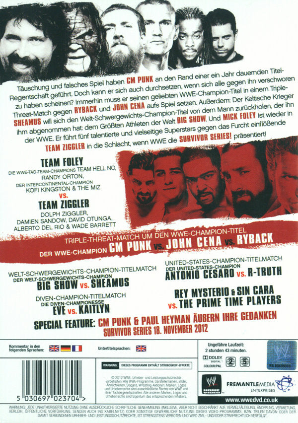 T�uschung und falsches Spiel haben CM Punk an den Rand einer ein Jahr dauernden Titel-Regentschaft gef�hrt. Doch kann er sich auch durchsetzen, wenn sich alle gegen ihn verschworen zu haben scheinen? Immerhin muss er seinen geliebten WWE-Champion-Titel in einem Triple-Threat-Match gegen Ryback und John Cena aufs Spiel setzen. Au�erdem: Der Keltische Krieger Sheamus will sich den Welt-Schwergewichts-Champion-Titel von dem Mann zur�ckholen, der ihn ihm abgenommen hat: dem Gr��ten Athleten der Welt Big Show. Und Mick Foley ist wieder in der WWE. Er f�hrt f�nf talentierte und vielseitige Superstars gegen das Furcht einfl��ende Team Ziggler in die Schlacht, wenn WWE die Survivor Series pr�sentiert!