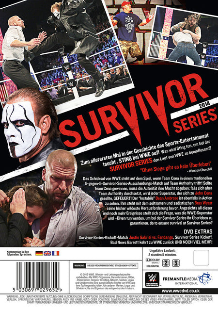 Das Schicksal von WWE steht auf dem Spiel, wenn Team Cena in einem tradionellen 5-gegen-5-Survivor-Series-Ausscheidungs-Match auf Team Authority trifft! Sollte Team Cena gewinnen, muss die Autorität ihre Macht abgeben; falls sich aber Team Authority durchsetzt, wird jeder Superstar, der sich zu John Cena gesellte, GEFEUERT! Der „Instabile“ Dean Ambrose ist ebenfalls in Action zu sehen. Ihm steht mit dem seltsamen und sadistischen Bray Wyatt seine bisher wildeste Herausforderung bevor. Angesichts all dieser und noch mehr Ereignisse stellt sich die Frage, was die WWE-Superstar und –Diven tun werden, um bei der Survivor Series ihr Überleben zu garantieren.